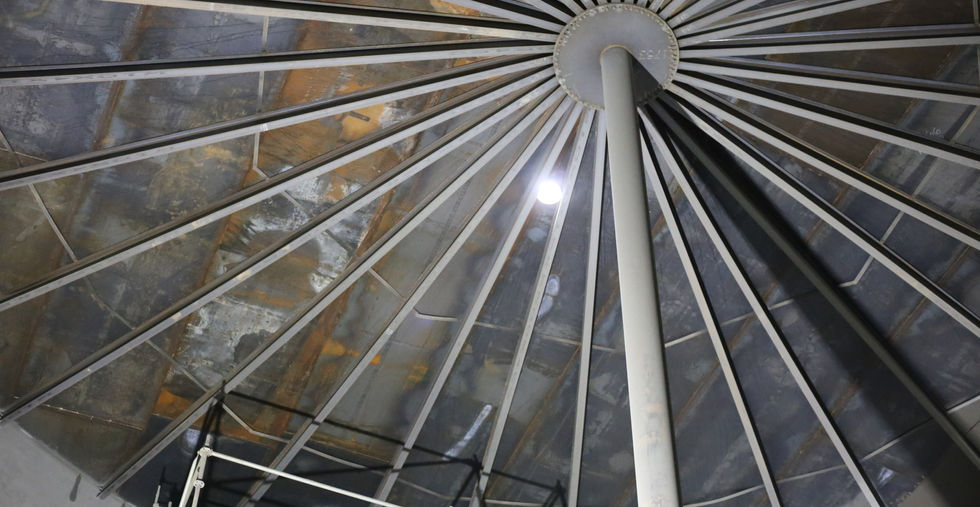 The first step in this project was sandblasting the fire water tower. This process involved using high-pressure air to propel abrasive materials, effectively removing layers of old paint, rust, and other contaminants. This thorough cleaning not only prepared the surface for new coatings but also extended the lifespan of the structure, ensuring it remains functional and safe. Our team sandblasted the interior walls, floors, and dome ceilings of two steel tanks — measuring 62 feet in diameter by 48 feet high and 86 feet in diameter by 40 feet high — to a near-white metal finish using 30/60 garnet abrasive. Following thorough blow-down and cleanup, surfaces were prepared for coating.